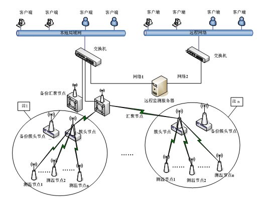 系统由现场无线数据采集网络、远程监测服务器、客户端软件构成。无线采集网络由传感节点、簇头节点、汇聚节点。远程监测服务器由一台高性能服务器和相关应用软件构成。应用软件包括:前端数据采集程序、数据库服务、分布式应用服务器程序、Web服务程序等。客户端的主要功能包括:实时监测、实时曲线、统计分析、报警列表、系统管理、程序更新等功能模块。