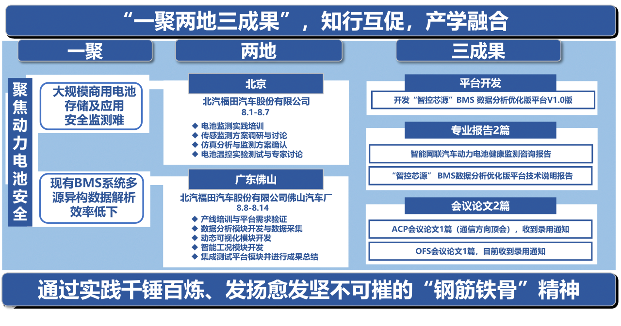 该团队与中国商用车领军企业北汽福田深度合作,聚焦动力电池安全技术需求,以“科技服务”为熔炉、“挂职锻炼”为砧板,围绕“一聚两地三成果”核心脉络,针对两大难题展开攻坚:一是解决电池仓库大规模商用电池存储安全及温度监测难题,提出“分布式-高精度、多维度-高集成”实时监控方案并探索采用OFDR分布式光纤传感等新技术,以期实现更全面、灵活的监测效果;二是针对现有BMS数据平台效率低、分析不动态、判断不智能问题,一周内开发“智控芯源”BMS数据分析平台优化版本V1.0,集成数据解析、动态可视化和智能工况识别等功能,且经测试显著提升了数据分析的效率与准确性。此次实践不仅锤炼了团队解决复杂工程问题的能力,实现了从理论到实践的跨越,还为产学研深度融合打通“从实验室到生产线”的快车道。