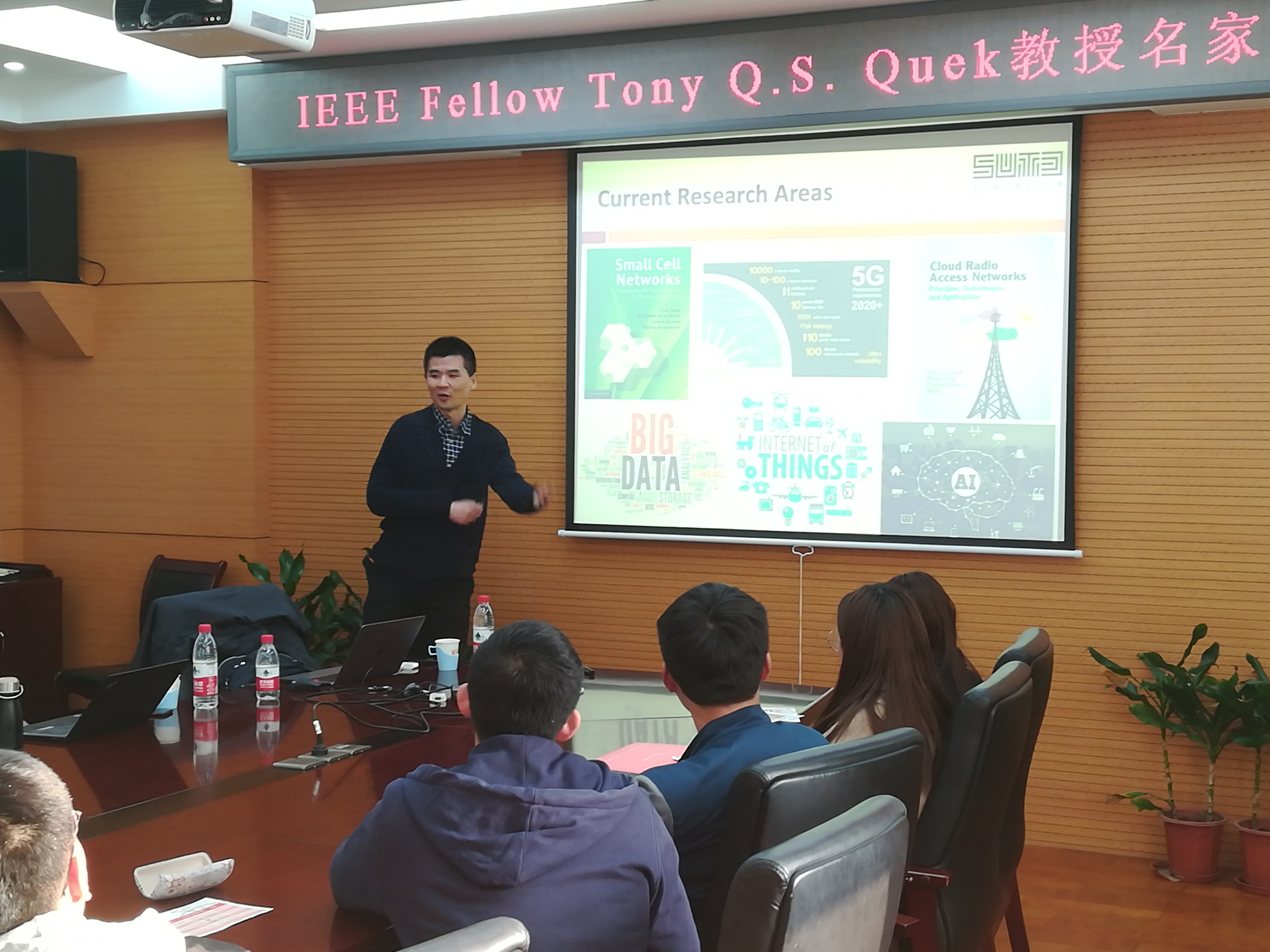 在报告会上,Tony教授分别分享了他团队在新加坡科技与设计大学进行的最新研究成果和他个人的求学、治学、从事科研和教职的经验和心得。在Massive MIMO技术方面,重点探讨了他团队在mMTC和uRLLC等物联网场景下,现在和未来的研究热点、技术挑战和机会。重点探讨了基于small cell场景下的资源调度和分配技术,针对uRLLC实时场景下的跨层网络优化方案以及接入控制技术等。随后,他还详细分享了他在日本和MIT的求学中遇见的各种问题以及解决思路和办法,最后他分享了在新加坡科技设计大学从事科研和教学中有关团队甄选、科研方向的选择、学生的指导、项目的策划等方面的宝贵经验。