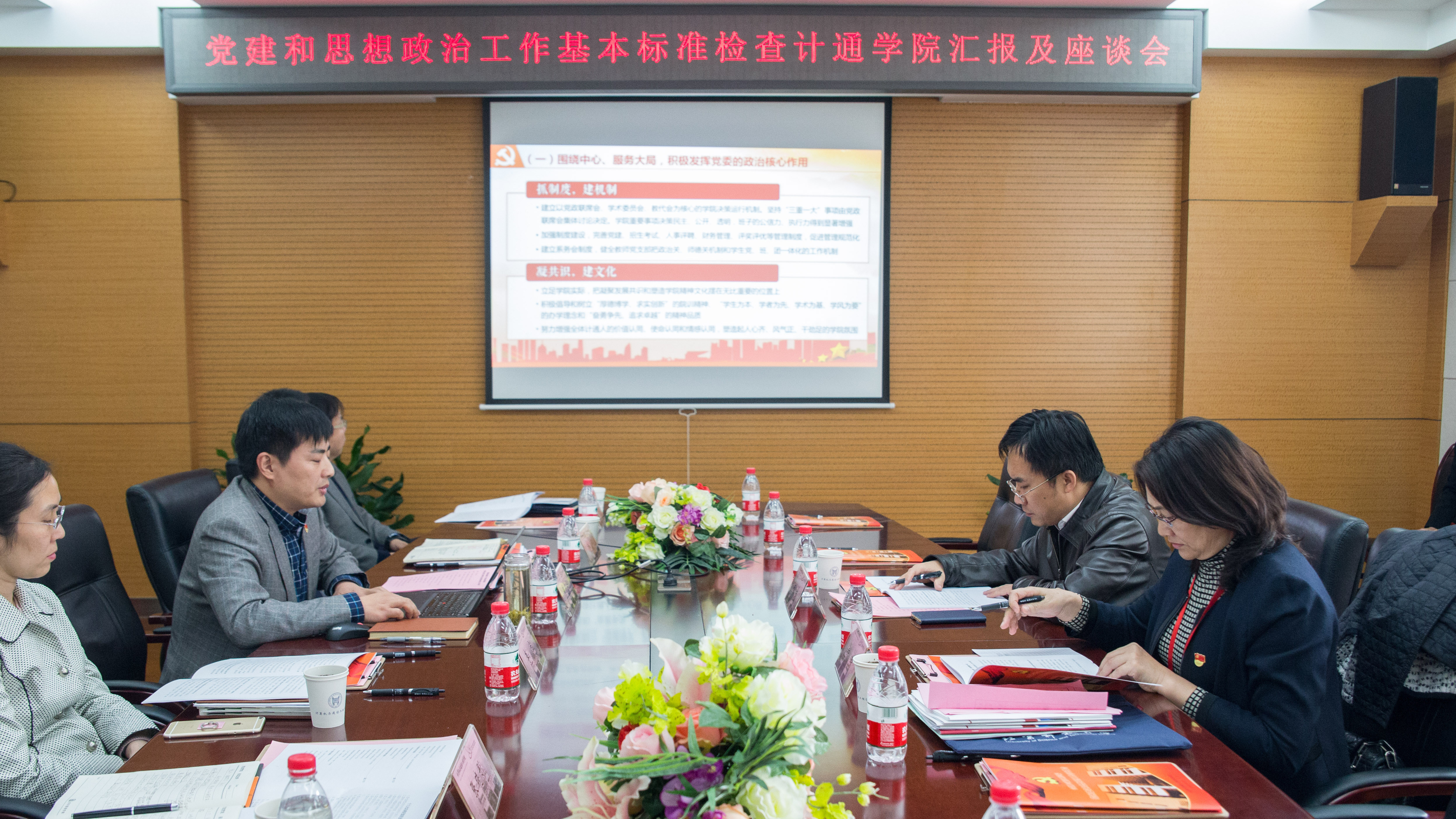 汇报会上,学院党委书记黄武南以《固本求新抓党建、引领发展创一流》为题,向党建工作检查组作了汇报,学院党政领导班子、党支部书记、青年教师及学生代表参加了汇报会。