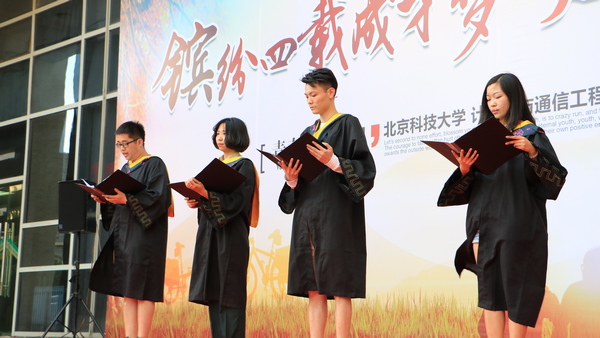 接下来毕业生代表带来了歌曲《儿时》和诗朗诵《那年今日,自相难忘》。同学们悦耳的歌声和发自内心、感人肺腑的分享,道出了全体毕业生的心声,深深地打动了在场的师生。“钢铁摇篮里,你茁壮成长,跌跌撞撞中竟有些猝不及防”,道出了成长的青涩与不安;“难过的时候不用惆怅,因为身后总有你关心的臂膀”,道出了同学师生之间浓浓的情谊;“自己的一生要根植于这片广袤的地方,北科大计通人的价值应当跃动在无垠的国疆”,道出了419名毕业生情系母校、心系祖国的情怀与梦想。
