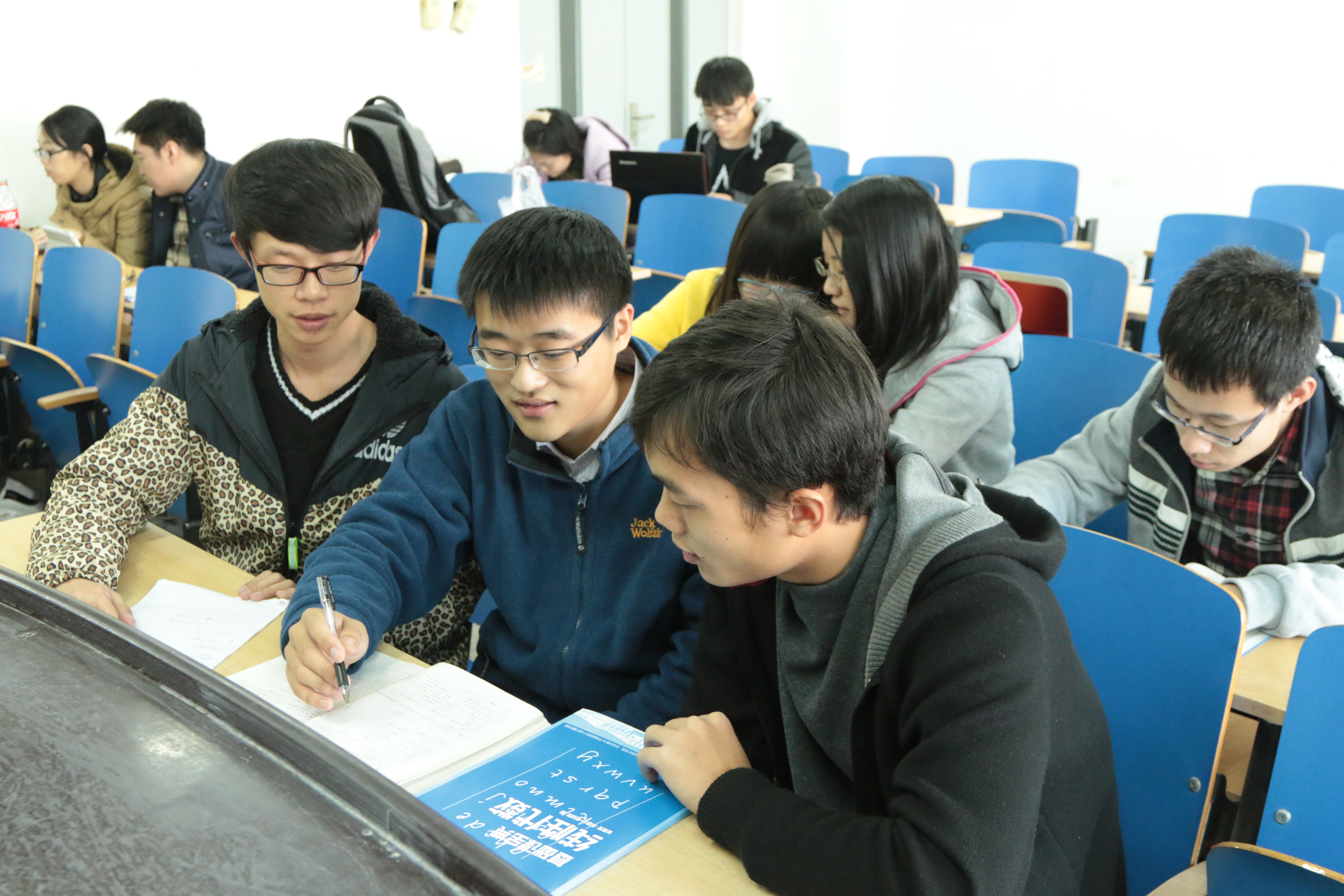 本14级学生的自习室里比以往人气旺了不少。信息楼721教室,信息安全1401班正在进行集体自习。看着同学们在用心准备大学里的第一场学业测试,已经有段日子没来自习室的新生小王显得有些紧张,他在入学后新生适应阶段的角色转换有些缓慢。这时,担任新生小班主任的学生党员唐锦抱着一套她们党支部编撰的基础课复习资料走进了自习室。