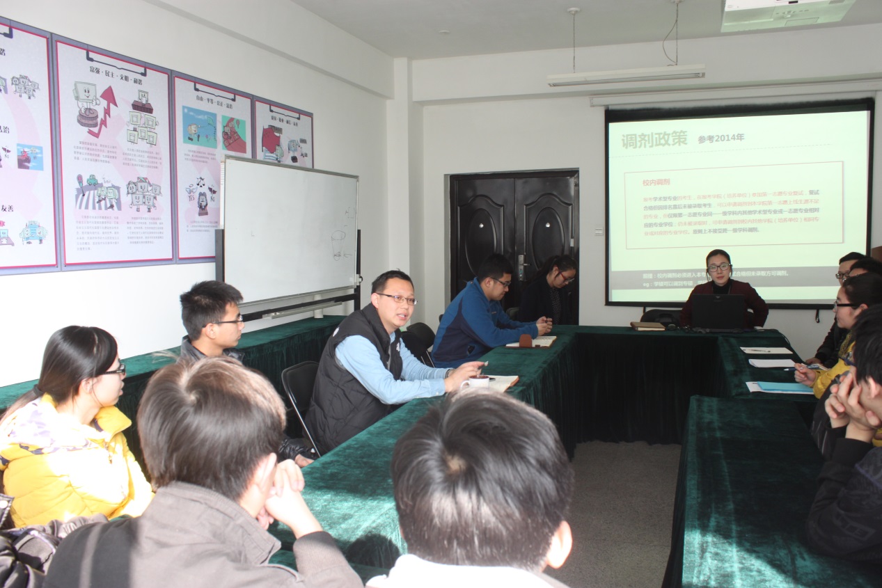 考研学生调剂去向以及近段时间学校学院的各类调剂信息。会上,几位老师对往年同学调剂的基本流程以及方法做了详细的阐释并为同学们解读了调剂的基本注意事项,帮助大家寻找理想的调剂学校,苏栋老师用具体数据说话,详细的向同学们介绍了近几年自慰喷水