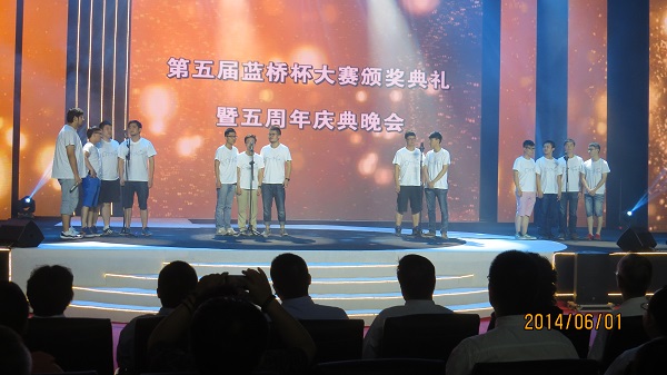 6月1日,在北京大学体育馆举行隆重的颁奖典礼暨蓝桥杯5周年庆典晚会。在颁奖的同时,大赛组委会精心为参赛师生准备了一场精彩纷呈的表演,我校选送的Mr.Youngs男生小合唱团,北京大学选送的健美操队,水木年华,大赛组委会和金证股份的代表,中国国家交响乐团和中央歌剧院的音乐家们,还有中国农业大学的街舞社分别为大家表演了精彩的节目。