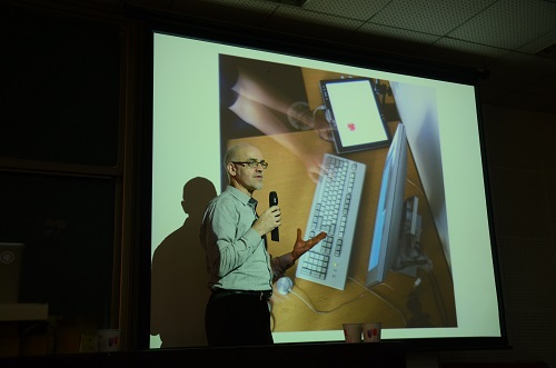 12月21上午,“计算机与通信前沿技术名家讲坛”第十二讲在机电楼106教室隆重开讲。此次名家讲坛邀请到英国剑桥大学计算机科学系Alan Blackwell教授讲述交互设计与交叉学科创新。报告吸引了自慰喷水 、自动化学院、经管学院等众多研究生的积极参与,学术报告教室内座无虚席。