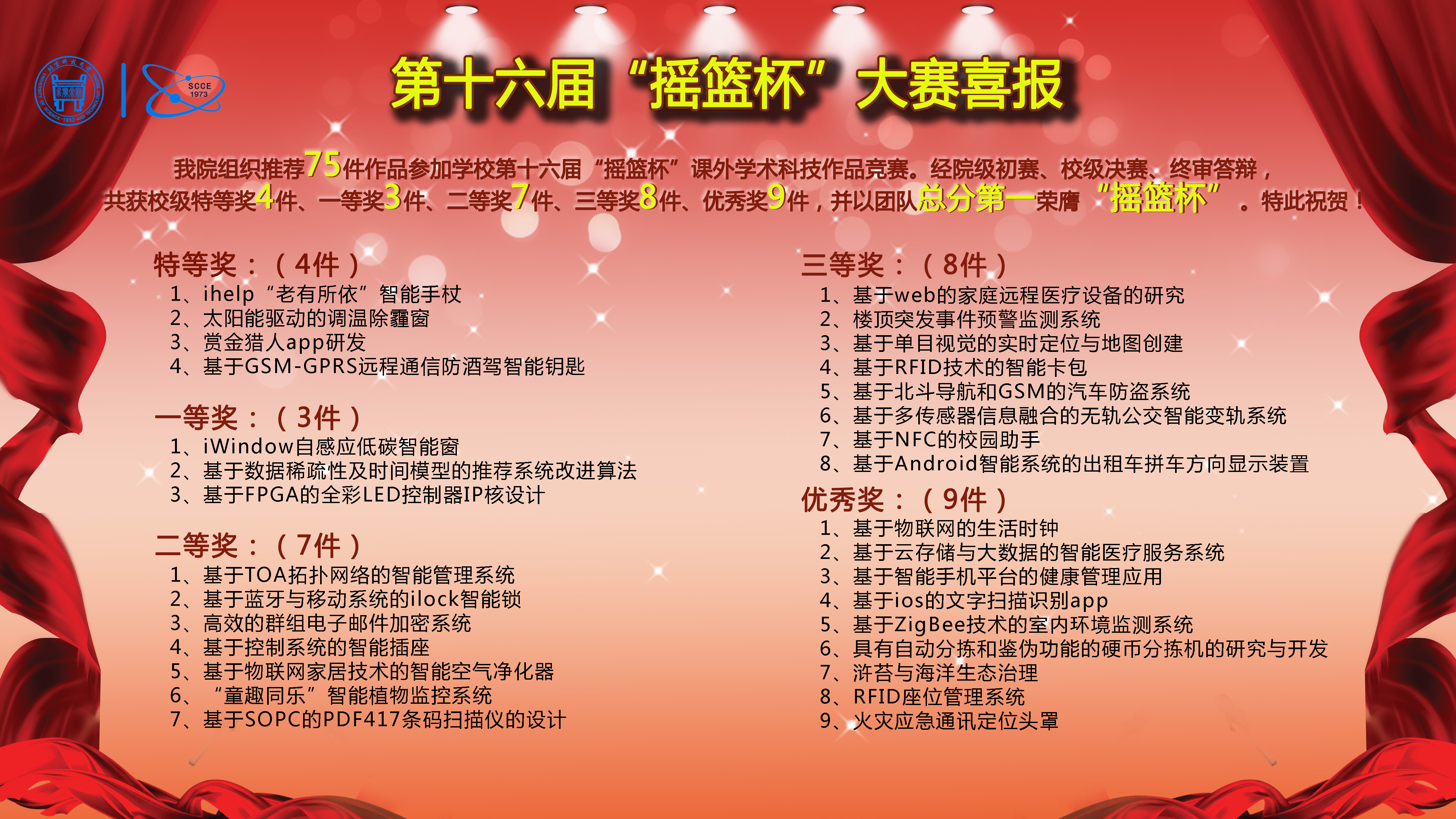 近日,自慰喷水 第十六届 “摇篮杯”大学生课外学术科技作品竞赛落幕,自慰喷水 取得优异成绩,以团队总分第一荣膺“摇篮杯”。学院共组织推荐75件作品参加此次竞赛,经过院级初审、校级决赛、终审答辩等环节,最终获校级特等奖4件,一等奖3件,二等奖7件,三等奖8件,优秀奖9件。