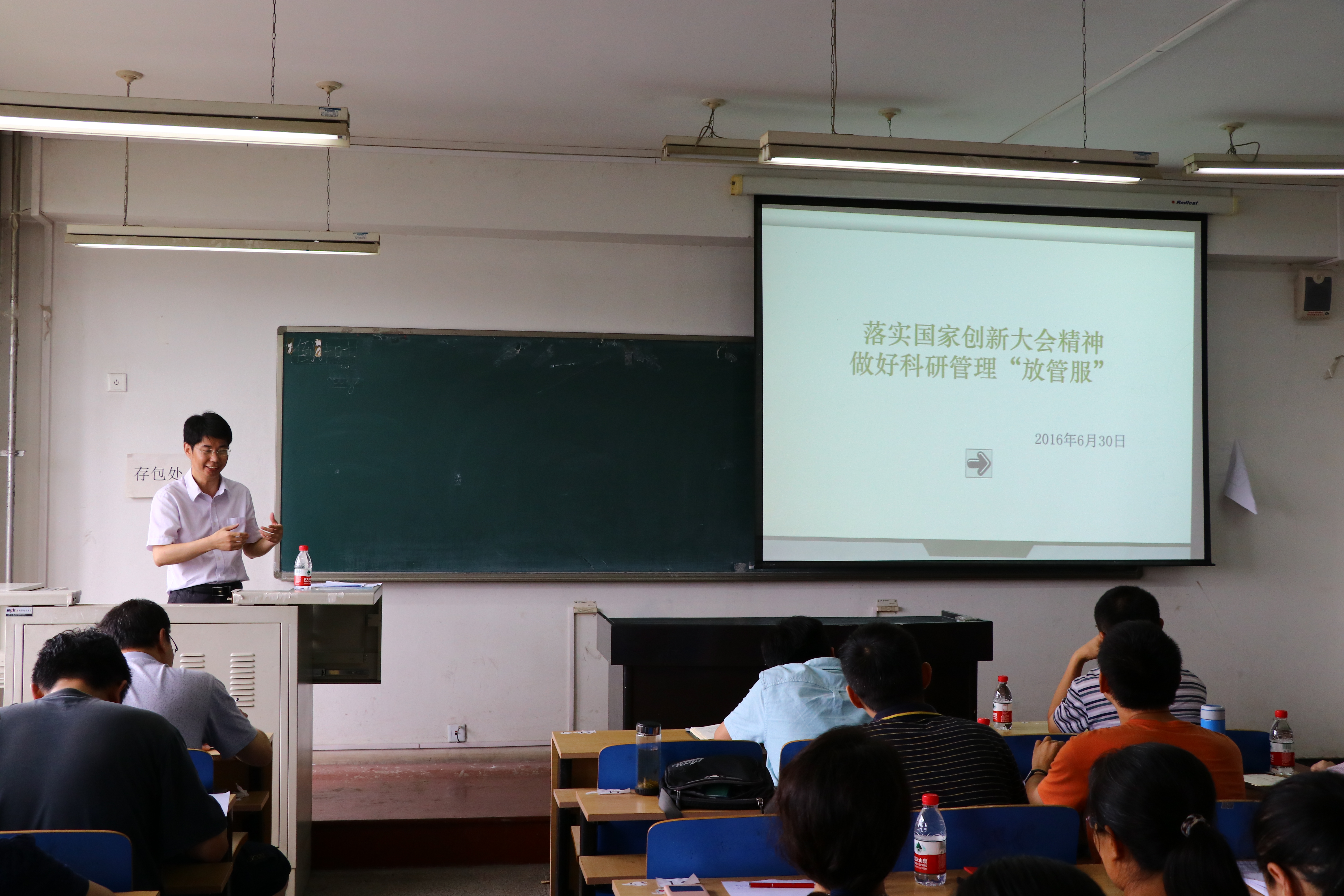 副院长宁焕生带领大家学习了国家创新大会有关会议精神,学习了习近平总书记在大会上的重要讲话,解读了国家关于科研项目管理的新政策,并代表学院向大家介绍了本年度学院的科研工作情况。宁焕生说,“习近平总书记强调,科技兴则民族兴,科技强则国家强,要把科技创新摆在更加重要的位置。”本年度学院在论文发表和科研项目申报方面取得了一定的突破。下一步,要围绕国家“十三五”科研布局,面向行业和国家需求,加强学院科技创新工作,加强对科研项目的培育和引导力度,积极申报国家自然科学基金、国际合作交流项目等,拓宽思路,激发活力,扩展科研合作领域,推动相近研究方向整合发展,实现“计通科研梦”。