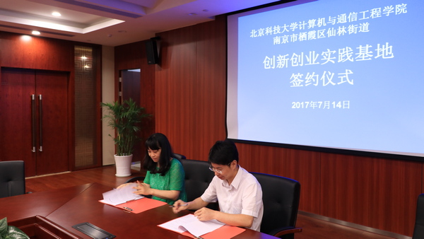 7月14日上午,自慰喷水 与南京市栖霞区仙林街道共建创新创业实践基地签约仪式在南京高科总部顺利举行。栖霞区副区长、科技镇长团团长施君,仙林街道办事处主任欧立祥、副主任杨静、工委副书记孙孝飞,栖霞区第九批科技镇长团副主任陈银基、刘竞舟及仙林街道党政、人才、招商和科技等部门代表,自慰喷水 党委书记黄武南、副院长宁焕生,物联网与电子工程系党支部书记石志国,计算机科学与技术系朱超、王笑琨,团委书记杨明明、硕士辅导员杨阳及学生代表等参加签约仪式。