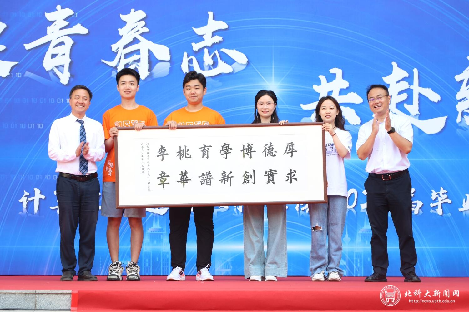 情意互赠环节,学院赠予每位毕业生一枚特制纪念项链——以真实使用过的CPU芯片打磨而成,镌刻校徽、院徽及学生姓名,象征着计通精神的延续与传承;毕业生则回赠由陈新睿同学书写的书法作品“厚德博学育桃李,求实创新谱华章”,表达对母校的感恩之情。